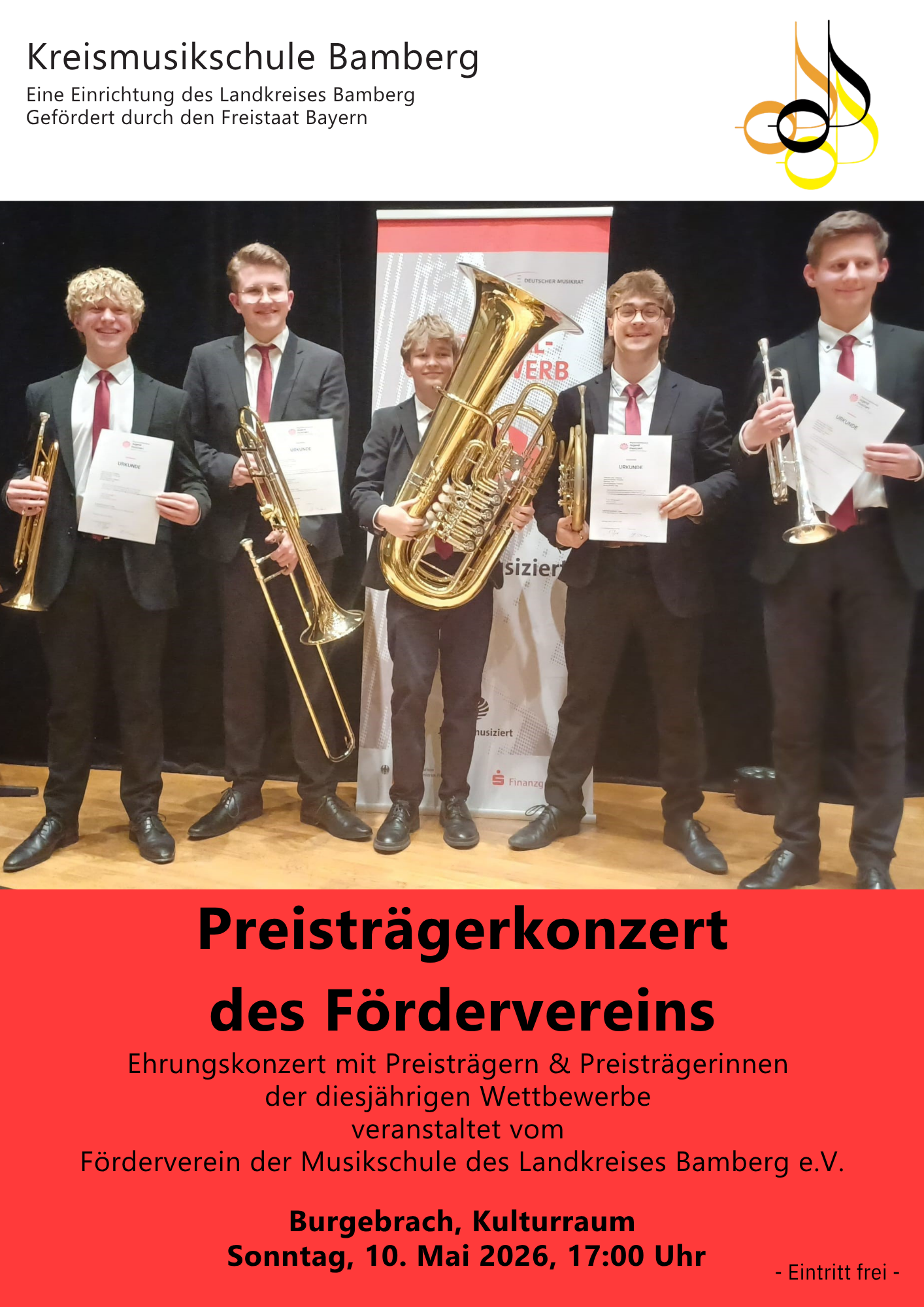Im Anschluss an den „Tag der offenen Tür“ besteht im Zeitraum 27.04.- 13.05.2026 für alle Interessierten die Möglichkeit, Unterrichtsstunden in allen Fächern der Kreismusikschule (Unterrichtsorte im gesamten Landkreis) zu besuchen und „Unterrichtsluft zu schnuppern“. Für eine Terminvereinbarung wenden Sie sich bitte an die Verwaltung der Kreismusikschule unter 0951 85-165 oder musikschule@lra-ba.bayern.de