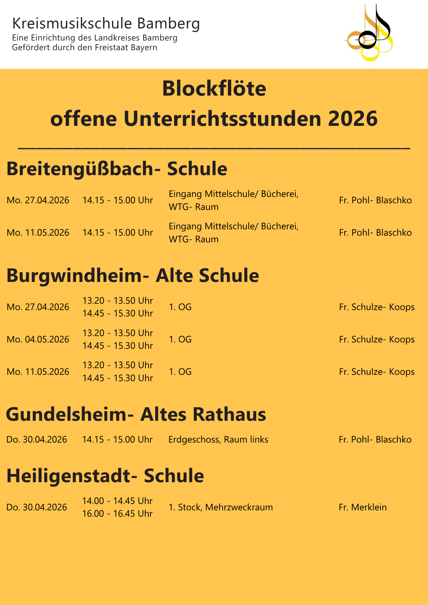 Im April und Mai bietet die Kreismusikschule wieder für alle Interessierten offene Unterrichtsstunden „Schnupperstunden“ im Fach Blockflöte an. Die offenen Unterrichtsstunden finden in mehreren Orten im Landkreis Bamberg statt. Hier finden Sie alle Termine: https://www.kreismusikschule-bamberg.de/2026/04/01/offene-unterrichtsstunden-blockfloete/