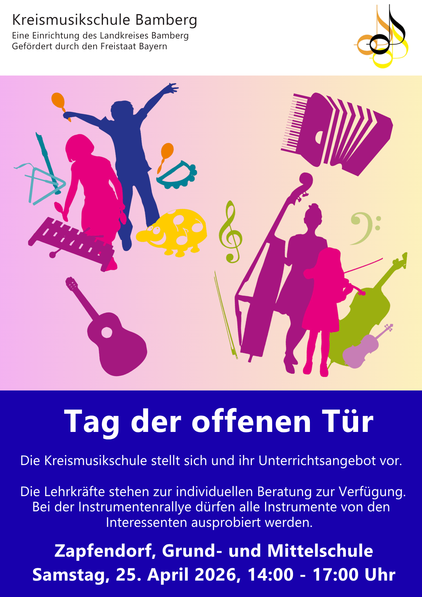 Die Kreismusikschule Bamberg lädt zum Tag der offenen Tür am Samstag, 25. April 2026 von 14:00 bis 17:00 Uhr in der Grund- und Mittelschule Zapfendorf ein.