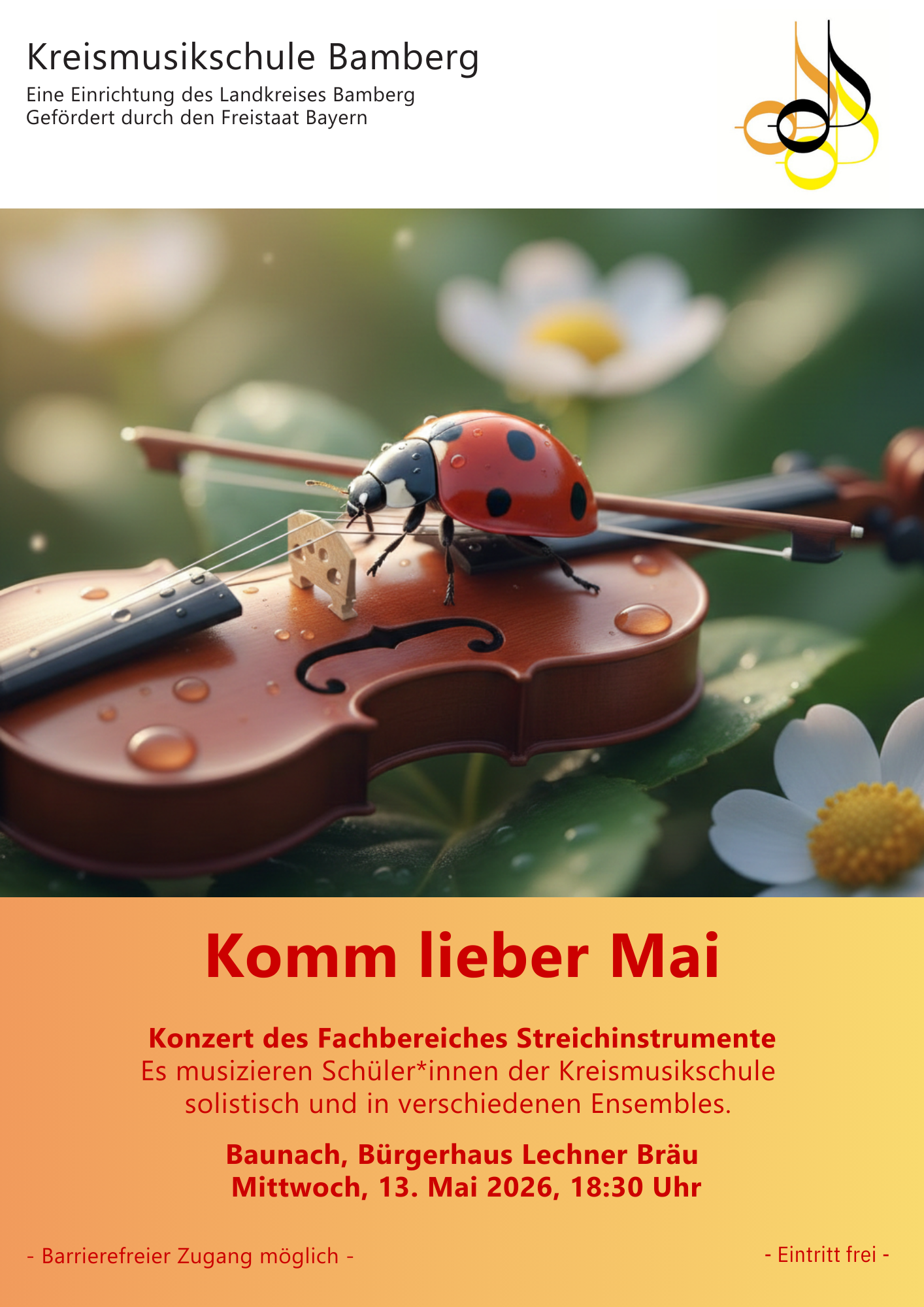 Der Streicherfachbereich der Kreismusikschule lädt Sie am 13. Mai 2026 um 18:30 Uhr ganz herzlich nach Baunach ins Bürgerhaus Lechner Bräu zu einem abwechslungsreichen Konzert ein. Es musizieren Schüler und Schülerinnen solistisch und in verschiedenen Ensembles. Der Eintritt ist frei, Zuhörer sind herzlich willkommen.